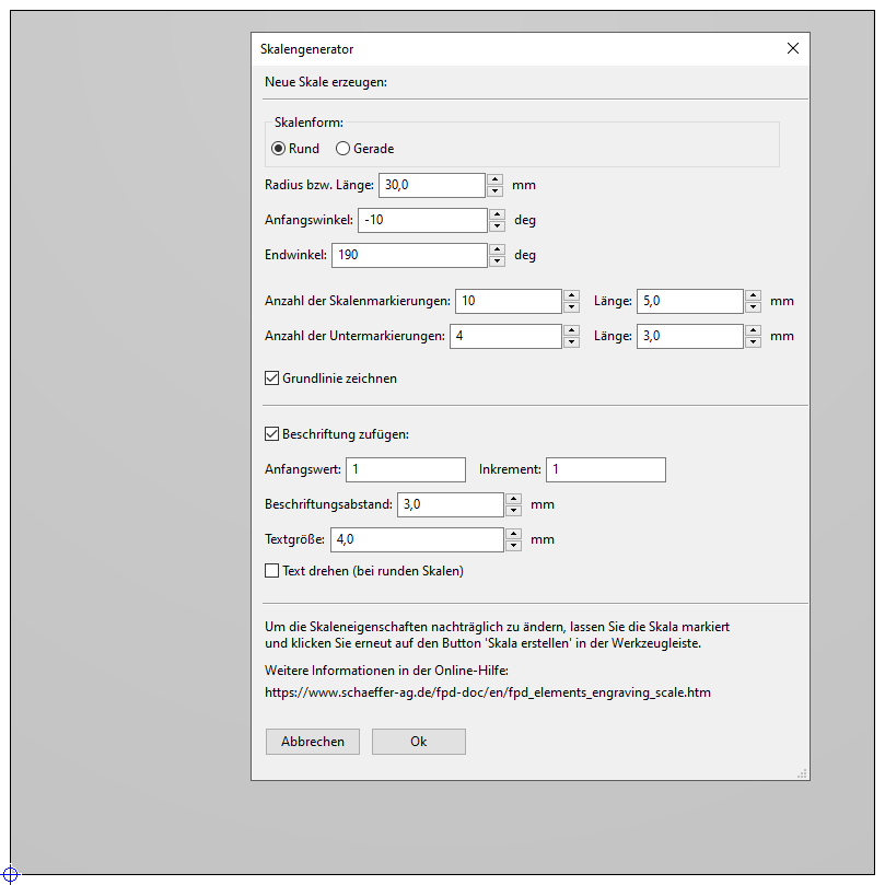 The scale generator creates a scale as an HPGL engraving element, as well as a label in the form of text engraving elements if necessary. A labeled scale is inserted as a group.